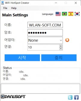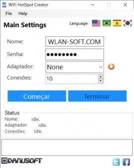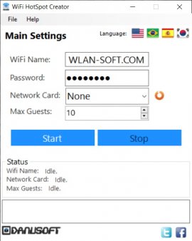 Хоть интерфейс не на русском, он интуитивно понятен. После запуска от пользователя требуется лишь указать желаемое название создаваемой точки доступа (SSID) и пароль. Источник WAN выбирается автоматически, но можно указать и вручную. Поддерживаются даже Bluetooth-модемы и смартфоны, подключенные к ПК по USB. Приложение можно добавить в автозапуск Windows.